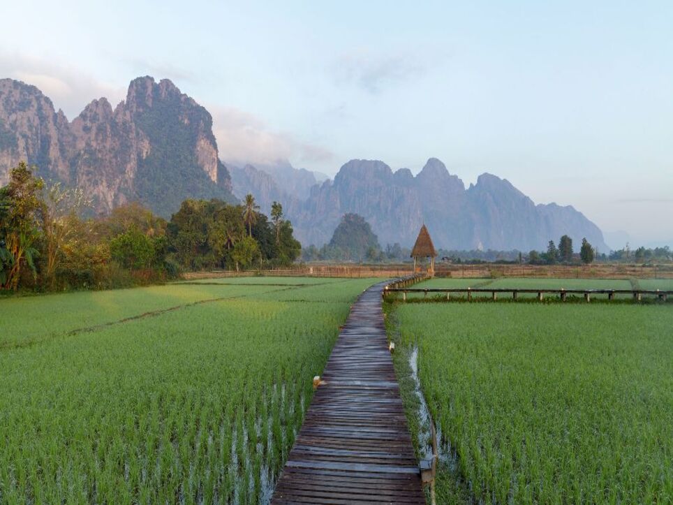 Po śniadaniu wyruszymy pociągiem w kierunku Vang Vieng. Przejazd zajmie około dwóch godzin i zaprowadzi nas do niewielkiej miejscowości położonej nad rzeką Nam Song, w otoczeniu pól ryżowych oraz imponujących, wapiennych formacji skalnych. Ten krajobraz dopełnia codzienne życie mieszkańców – dzieci bawiące się nad wodą i rybacy nadają temu miejscu autentyczny, lokalny charakter. Popołudnie upłynie w spokojnym, sielskim rytmie, idealnie dopasowanym do atmosfery Vang Vieng. Czas na relaks połączymy z jedną z najbardziej rozpoznawalnych atrakcji regionu – tubingiem. Spływ rzeką na pontonie w formie opony to nie tylko świetna zabawa, ale także doskonała okazja, by z perspektywy wody podziwiać otaczające dolinę góry. Wzdłuż rzeki znajdują się klimatyczne bary i kawiarnie z hamakami, spokojną muzyką i luźną atmosferą, które sprzyjają zatrzymaniu się na dłużej. To właśnie stąd najlepiej obserwować zachód słońca – gdy wapienne szczyty, wiszące mosty i unoszące się nad doliną balony tworzą niezwykle malowniczą, niemal magiczną scenerię.